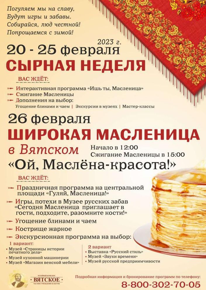 Праздничная программа на центральной площади «Гуляй, Масленица!» (30 мин.) Игры, потехи в Музее русских забав «Сегодня Масленица приглашает в гости, подходите, разомните кости!» (30 мин.) Экскурсионная программа на выбор (1 час 40 мин.):