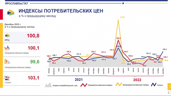 100,8 процента – таков сводный индекс потребительских цен в регионе в декабре относительно предыдущего месяца. Индекс цен на продовольственные товары составил 100,1 процента, непродовольственные – 99,6, на платные услуги – 103,1 процента. Такие цифры озвучили в Ярославльстате.