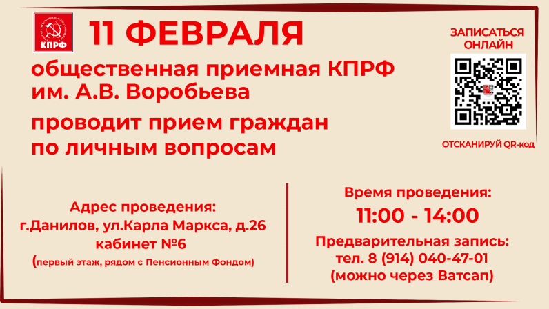 Уважаемые товарищи! 11 февраля общественная приемная КПРФ им. А.В. Воробьева проводит прием граждан по личным вопросам в Данилове.