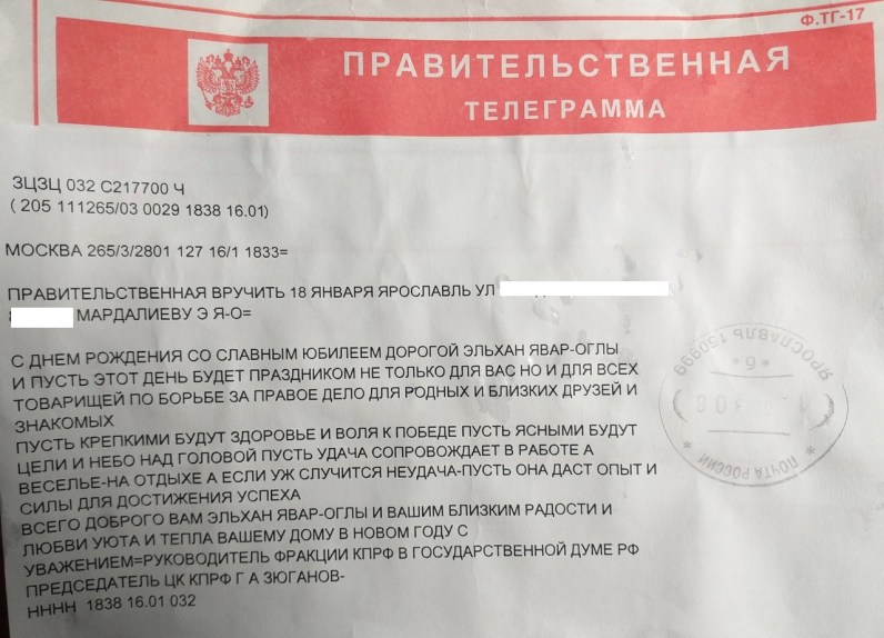 Правительственная телеграмма пришла Эльхану Мардалиеву и от Председателя ЦК КПРФ, руководителя фракции КПРФ в Государственной думе РФ Геннадия Андреевича Зюганова.