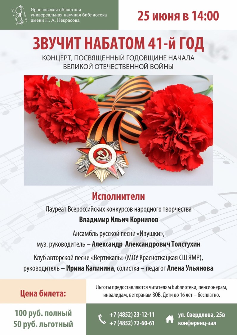 25 июня в 14:00 в конференц-зале Ярославской областной универсальной научной библиотеки им. Н.А Некрасова состоится концерт «Звучит набатом 41-й год», посвященный годовщине начала Великой Отечественной войны.