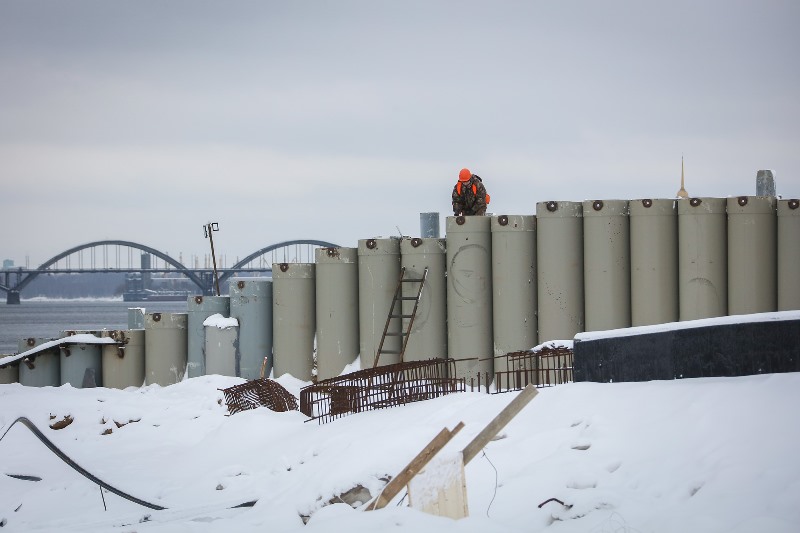 Погодные условия и соблюдение технологий позволяют не останавливать строительство берегоукрепльных сооружений в зимний период. Подрядчик - компания «ЕКС» - организовал работы на объекте в две смены, задействовано шесть единиц тяжелой техники. Пока уровень воды в Волге низкий, рабочие заняты на устройстве технологических съездов и лестничных спусков.