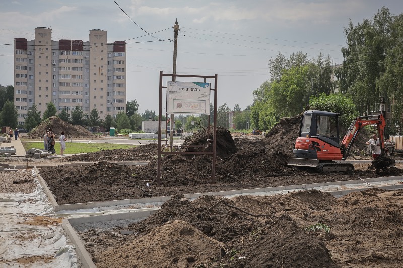 На территории практически завершены все земляные работы, смонтирован дренаж, установлены бордюрные камни, наполовину выполнены работы по укладке плитки на пешеходных дорожках, заложена и подготовлена к монтажу фонарей линия освещения, выполняется формирование детских площадок, ориентированных на ребят разных возрастов. На объекте трудится подрядная организация «Зеленый город».