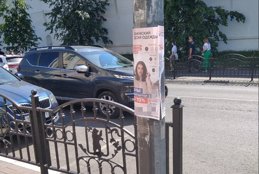 Листовки с рекламой финского дома одежды появились прямо на фасадах домов, а заодно на фонарных столбах и других местах, для объявлений не годящихся. Массовая расклейка объявлений была проведена прямо в зоне ЮНЕСКО. Ярославцев и гостей города звали приобретать куртки и пуховики с немыслимыми скидками.