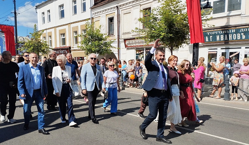 В этот раз вместе с главой Дмитрием Рудаковым он принял участие в новом для города проекте — Гербовом шествии, и поздравил горожан со сцены драмтеатра, где прошла торжественная церемония награждения почетных жителей Рыбинска и выпускников-медалистов.