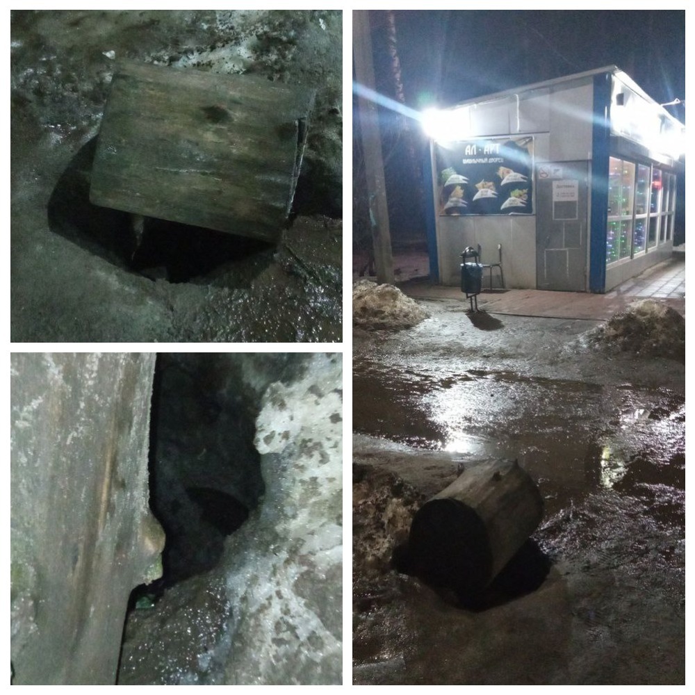 «Вчера туда провалилось авто колесом. Это место огородили, но кто-то убирает ограждения, работники, которые работают в этом магазине сегодня снова по просьбе привалили это место большим пнем, будьте осторожны, особенно смотрите за детьми, там очень глубоко и она ещё уходит в сторону», — предупредили местные жители.