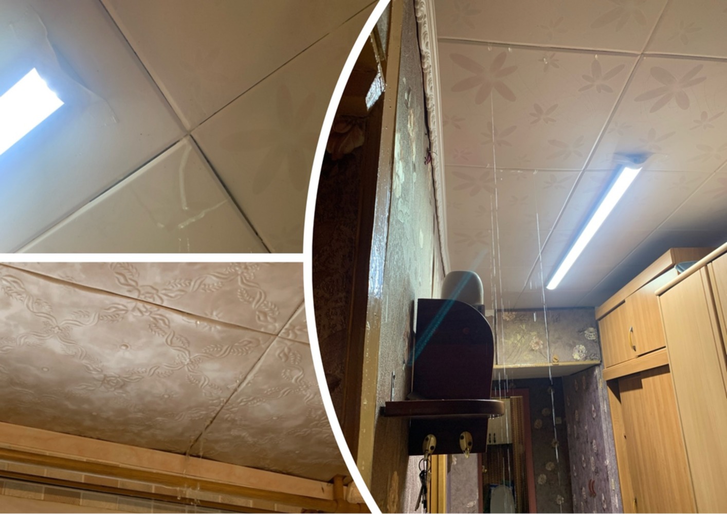 А затем потекло и в третьем подъезде, где стояк почти трое суток был без отопления. Слесари тепло дали и начался потоп. Жители говорят: льет сверху вниз. На текущий момент уже пострадали квартиры девятого, восьмого, седьмого, а может уже и шестого этажа. И это не пустые слова. В качестве подтверждения жители дома снимают видео. А там картина следующая: по квартире расставлены тазики и тряпочки, в которые с потолка не просто капает, а течет вода. Натяжные потолки превратились в пузыри, в которых скопилась вода.