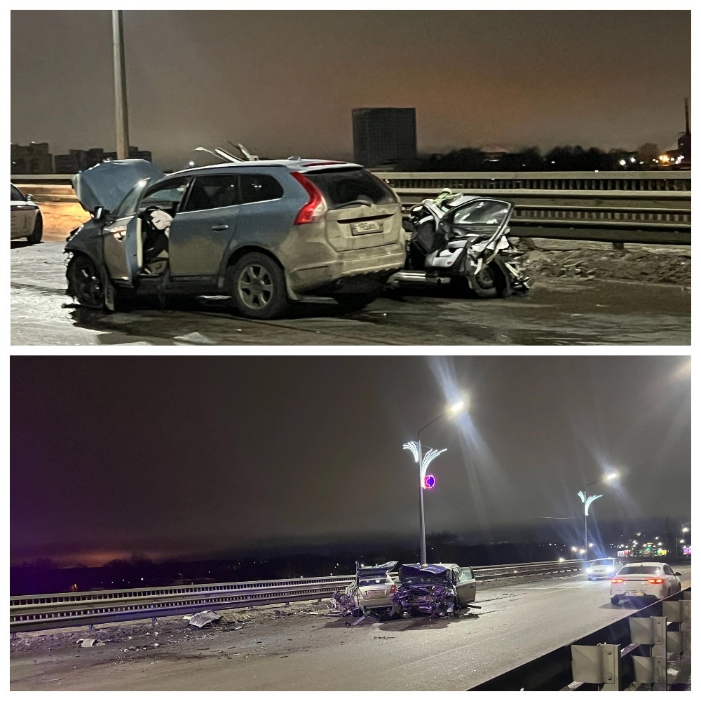 ДТП двух легковых машин произошло ночью 28 декабря на Октябрьском мосту Ярославля. Оба автомобиля пострадали достаточно серьёзно. Судя по всему, столкновение было лобовым, поскольку и та, и другая легковушка смяты именно спереди. Правда, если у кроссовера разбит капот, то вот седан превратился в металлический фарш почти до середины корпуса. По предварительным данным одна из машин вылетела на встречку.