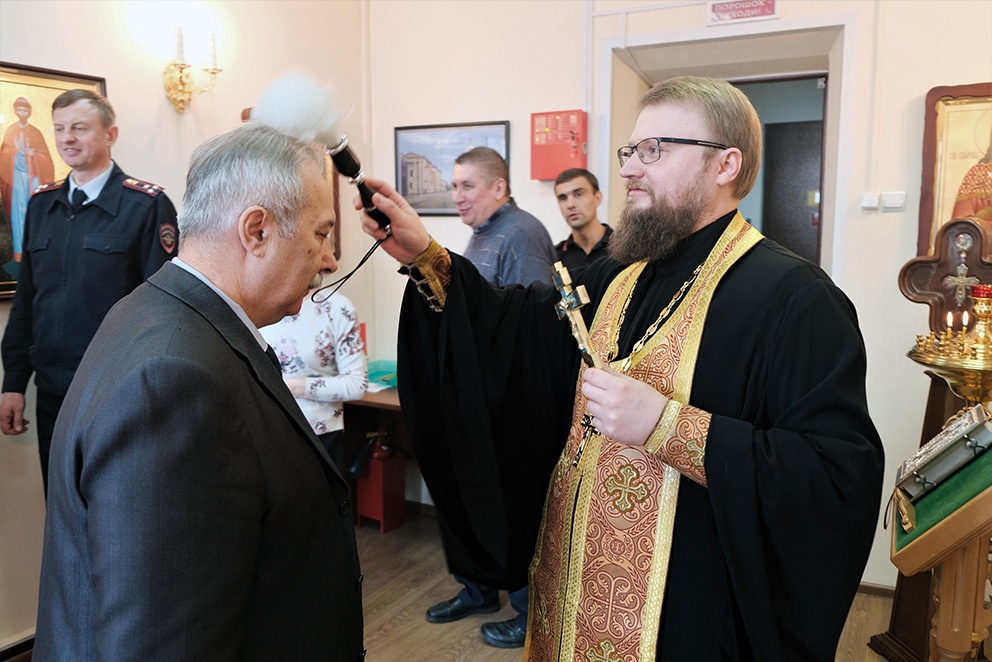 В преддверии дня памяти великомученика Георгия Победоносца, 5 мая 2023 года, помощник председателя епархиального Отдела по взаимодействию с Вооруженными Силами и правоохранительными органами иерей Никандр Колодезный совершил молебен в молитвенной комнате в честь Сошествия Святого Духа, расположенной в здании УМВД России по Ярославской области.
