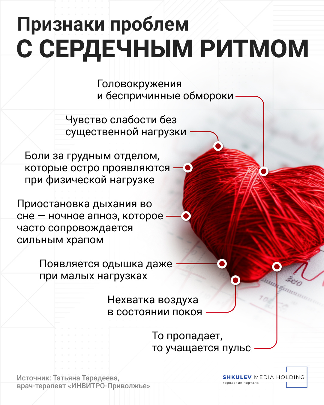Помимо проблем с сердцем, нарушение сердечного ритма является симптомом и других заболеваний. Например, тахикардия может быть одним из симптомов гипертиреоза — болезни, при которой щитовидная железа вырабатывает слишком много гормонов, которые воздействуют в том числе и на сердечную мышцу.