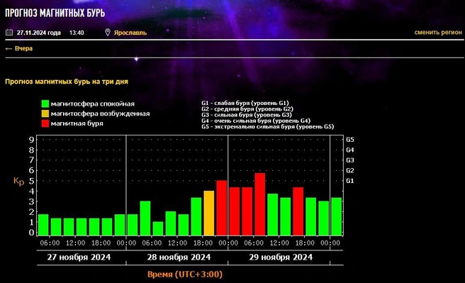 Интенсивность геомагнитного возмущения практически достигнет класса G2, что считается средним уровнем магнитной бури. Об этом свидетельствуют данные на сайте Лабораторий солнечной астрономии Института космических исследований и Института солнечно-земной физики (ИКИ и ИСЗФ).
